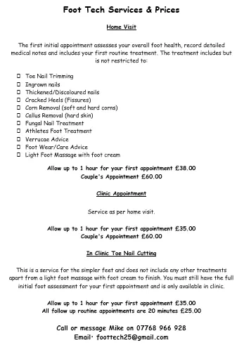 A new addition to services is foot health. Mike is a fully trained Level 4 Diploma Foot Health Practitioner and is a member of The Alliance of Private Sector Practitioners, giving you peace of mind of the level of training he has received and future training he has to do to remain on the register.